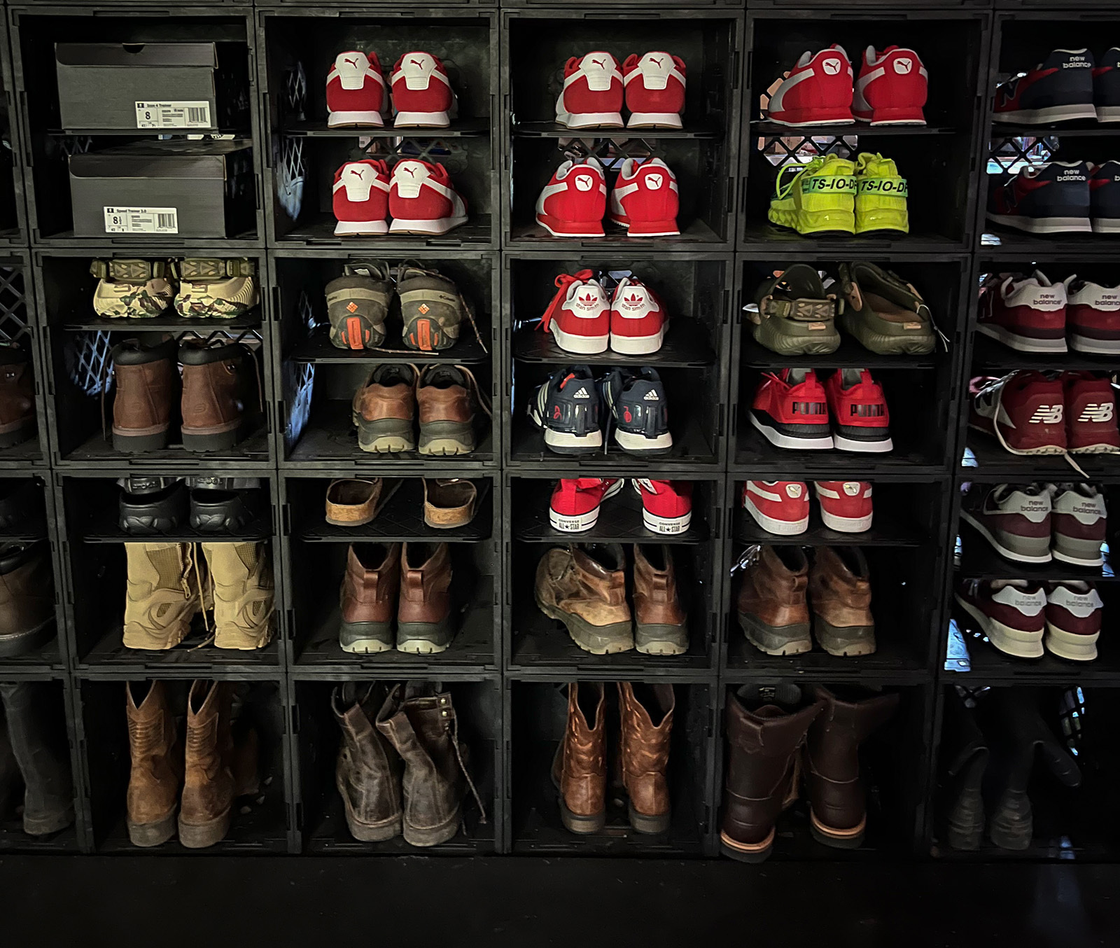 The result is a modular shoe wall that’s both functional and flexible. Every level serves a purpose, from rugged boot storage to clean sneaker display, all within a unified grid that keeps your gear easy to see and grab.
