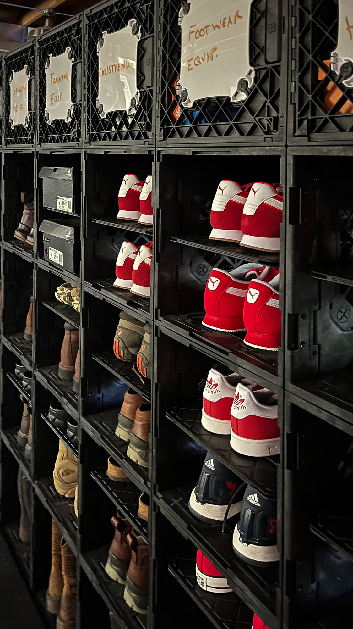 - Top tier: Built from UC02™ MOD Crates outfitted with Whiteboard MOD Panels, perfect for labeling sections like “Footwear Equip.” or “Training Gear.”