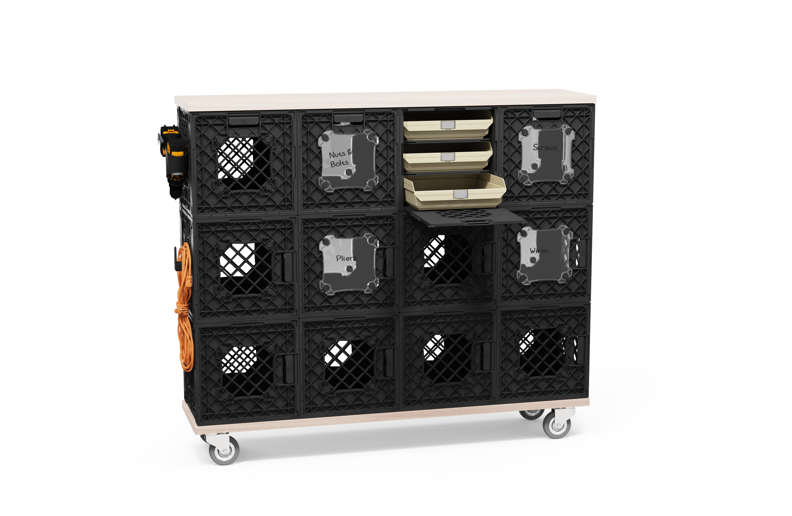 Say goodbye to digging through piles of tools. UbeCube™ crates can be outfitted with Grabinets™, trays, and dividers to hold everything from wrenches and screwdrivers to drills and garden gear. Keep your workbench clear by building a tower of crates next to it — or mount accessories like tool holders and hooks directly onto your system. Everything has its place, and you know exactly where to find it.