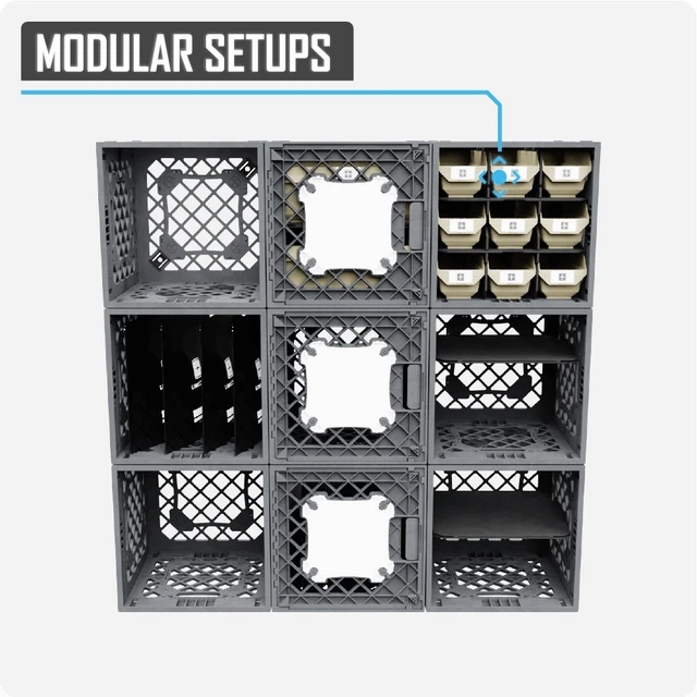 Flexible Layout: Configure the system as a 3×3 crate grid wall for a centralized storage station, or split it into three separate towers for distributed organization. Rearrange and adapt the layout to fit your garage, storage room, or workspace.