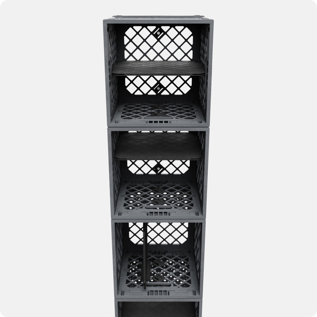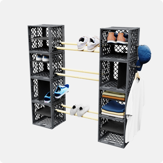 Crate-Integrated Shelving: Use CrateShelf™ Kits to divide each crate into organized compartments for sneakers, folded clothes, or everyday essentials. Short Poles and RodSnaps add open storage options for shoes and accessories.