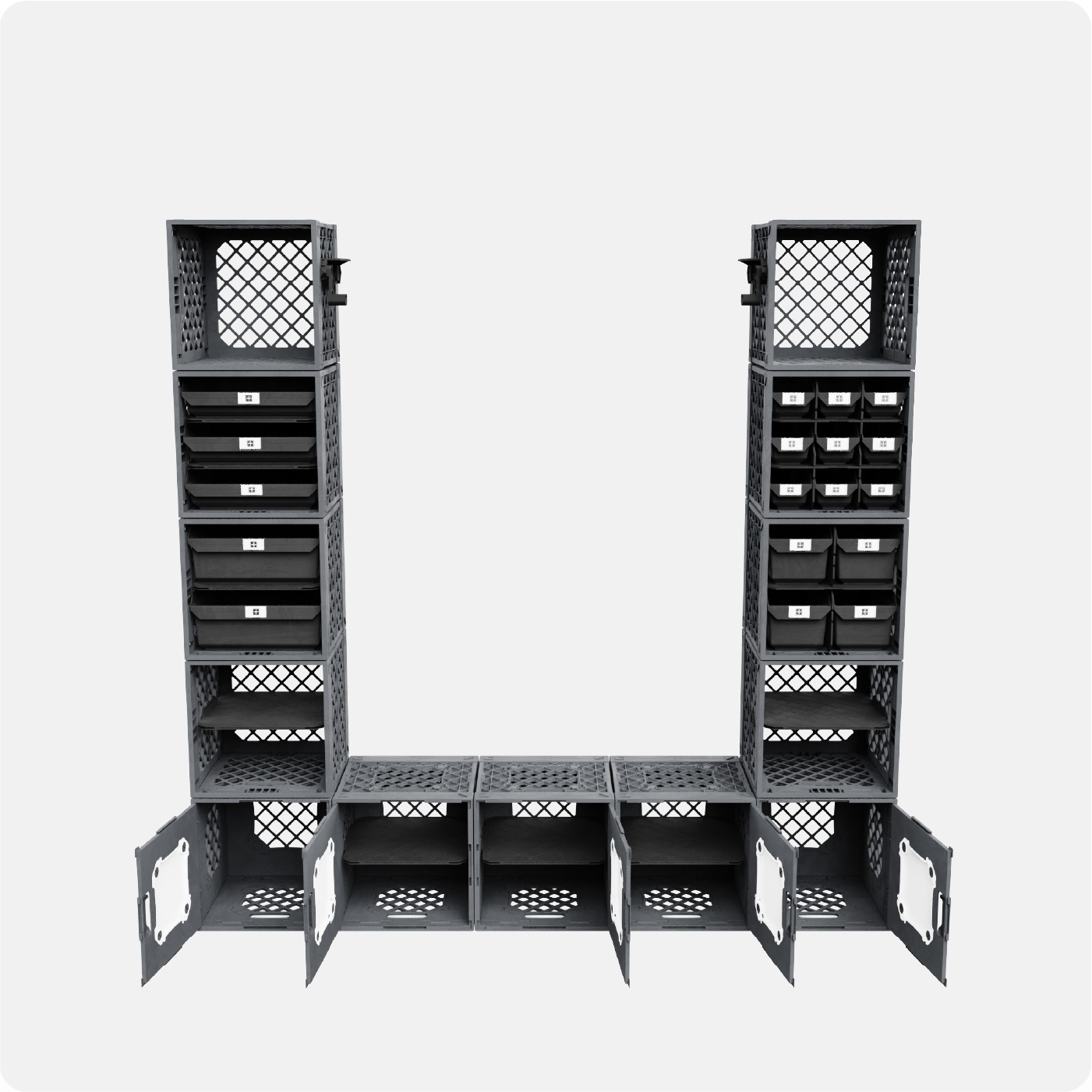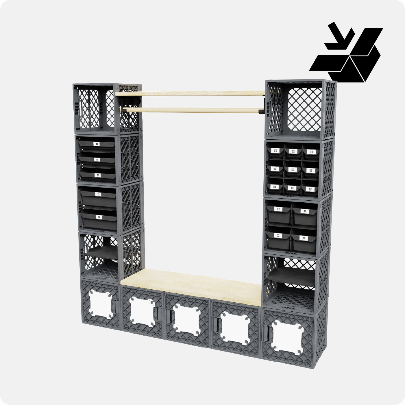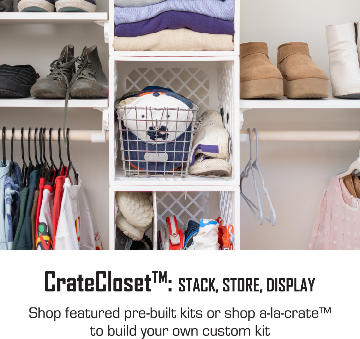 Build out your Crate base, add ClosetStrips™ and RodSnaps™ to mount shelves and rods, then UpCrate™ with bins, dividers, and accessories — transforming your space into a modular, expandable closet system.