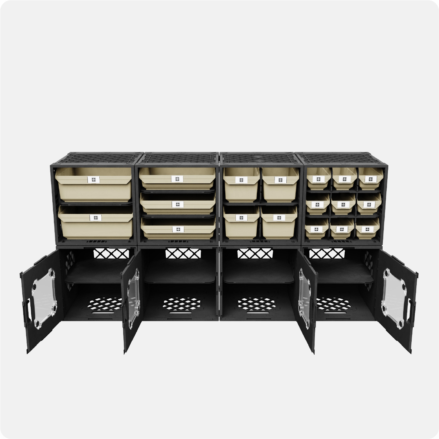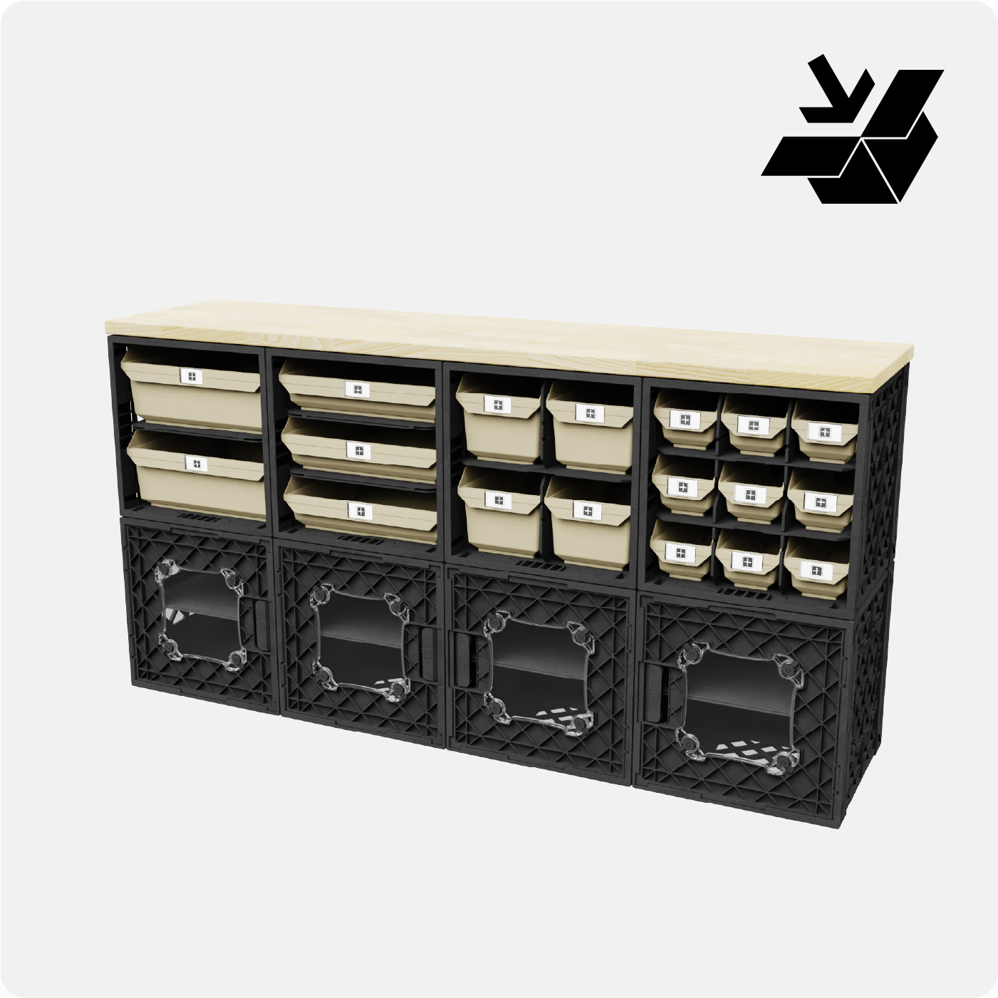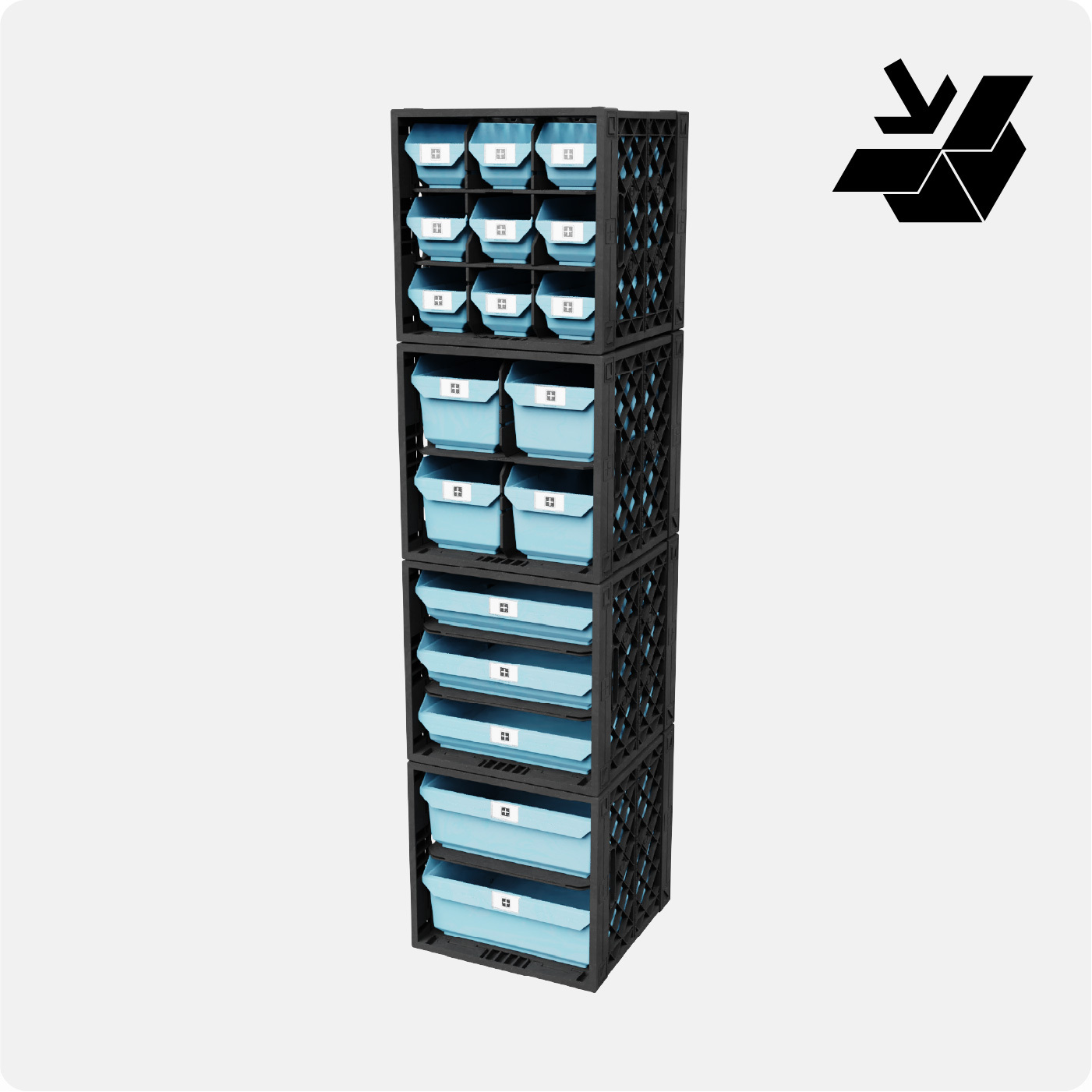 Build out your Crate base, add ClosetStrips™ and RodSnaps™ to mount shelves and rods, then UpCrate™ with bins, dividers, and accessories — transforming your space into a modular, expandable closet system.