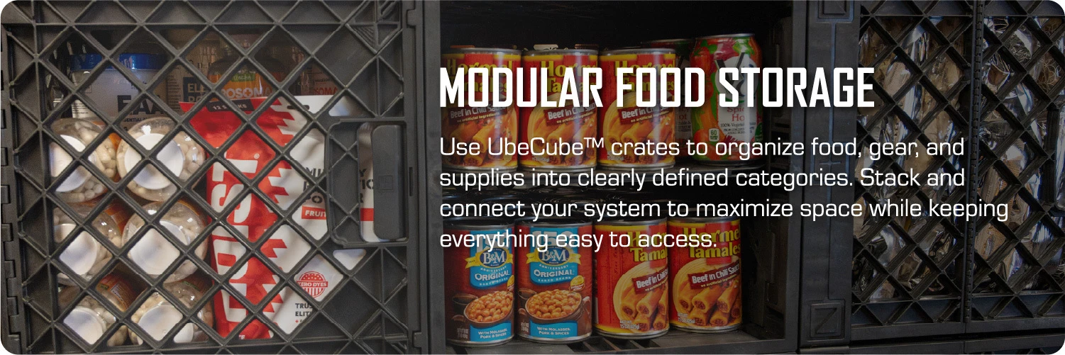 CratePrepper™ is a modular storage system designed to keep your emergency essentials organized and ready. Use UbeCube™ crates to store, stack, and access food, water, and critical supplies – keeping everything in its place when you need it most.