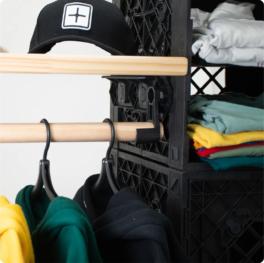 Crate Hanging Space: Use the Rod Extensions to hold a standard 1.25" dowel or rod to add space for hanging clothes, bags, or gear. Ideal for entryways, closets, workshops, or anywhere that you need to hang some items!
